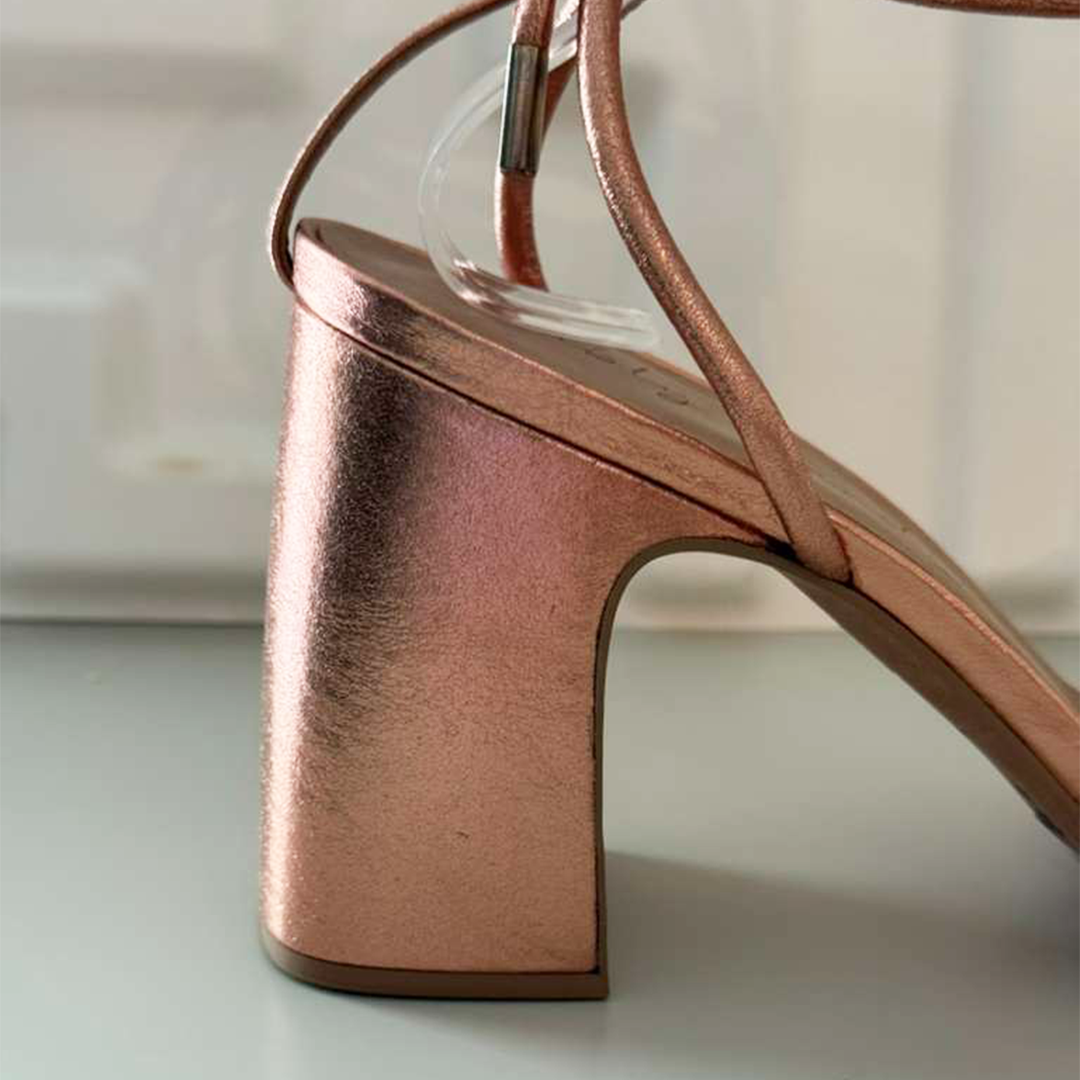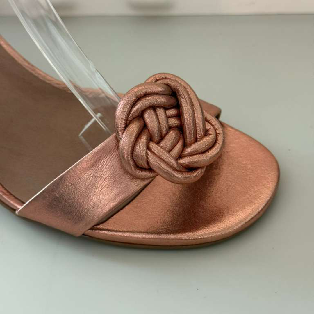 Sandal metalizada com aplicação de uma flor e amarração no tornozelo.